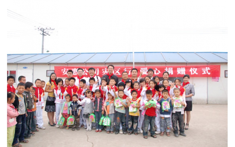 2009年5月12-13日,安惠公司舉行大地震周年系列紀(jì)念活動。副總經(jīng)理柯建民再赴德陽,給綿竹拱星小學(xué)孩子們送去“愛心包裹”。