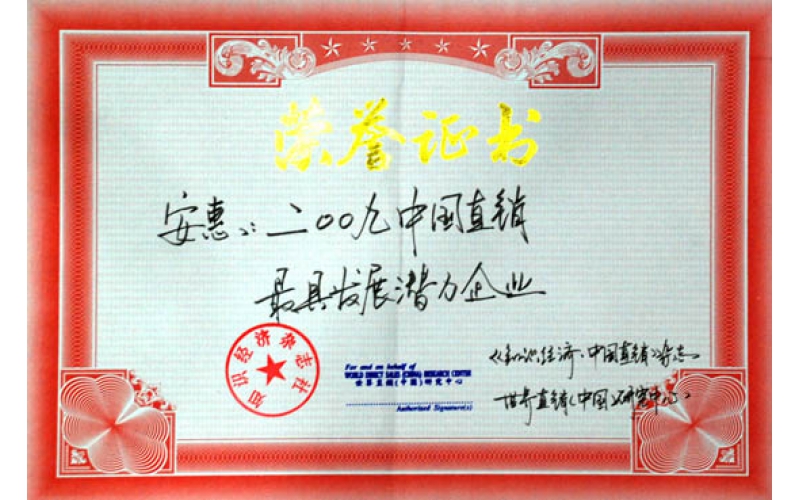 2009年6月,安惠公司被評為2009中國直銷最具發(fā)展?jié)摿ζ髽I(yè)。