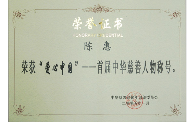2005年1月31日,中華慈善總會(huì)在北京民族飯店召開(kāi)新聞發(fā)布會(huì),陳惠董事長(zhǎng)當(dāng)選“愛(ài)心中國(guó)”——首屆中華慈善人物。
