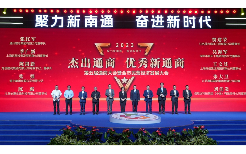2023年5月21日,第五屆通商大會(huì)暨南通民營經(jīng)濟(jì)發(fā)展大會(huì)在南通國際會(huì)議中心舉行。包括兩院院士、高校院所負(fù)責(zé)人、央企國企負(fù)責(zé)人、海內(nèi)外通商代表等在內(nèi)的600余名鄉(xiāng)賢、嘉賓相聚南通,共敘鄉(xiāng)情、共謀發(fā)展、共話未來。會(huì)上,安惠公司黨委書記、董事長陳惠再獲杰出通商殊榮。