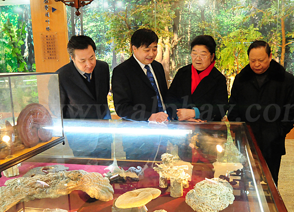 2011年1月25日,十屆全國人大常委會副委員長顧秀蓮(右二)在南通市人大常委會副主任宋飛(右一),南通市委常委、市委秘書長黃巍東(左一)的陪同下參觀中華靈芝文化館。